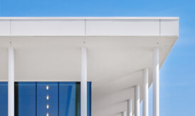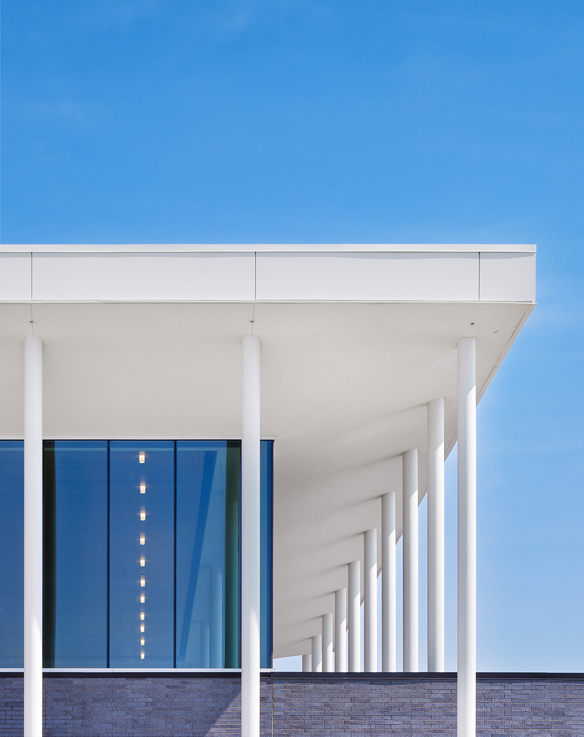 - A primary architectural feature of the addition is the colonnade (a row of columns supporting the roof) and a thin roof profile at the main entrance. This was achieved using a series of shallow or tapered steel roof beams supported by round steel HSS columns. Several columns also support the custom brise soleil on the south façade.