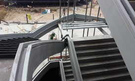- Monumental stairs — cantilevered with no columns, the complex geometry accomplished by double curves rolled in two directions