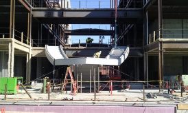 - Lower level — two large 22-ft. high column-free auditoriums required large bridge girder-style steel beams with flange plating