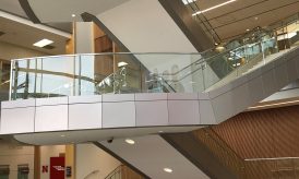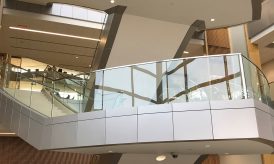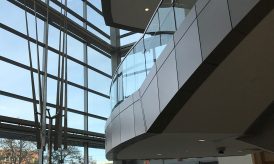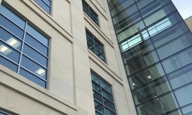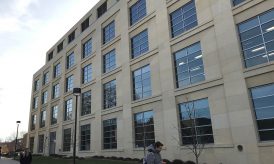 - Limestone clad classroom and office wings feature a central 4-story atrium bookended with multi-story glass curtain wall features containing grand stairs and landings
